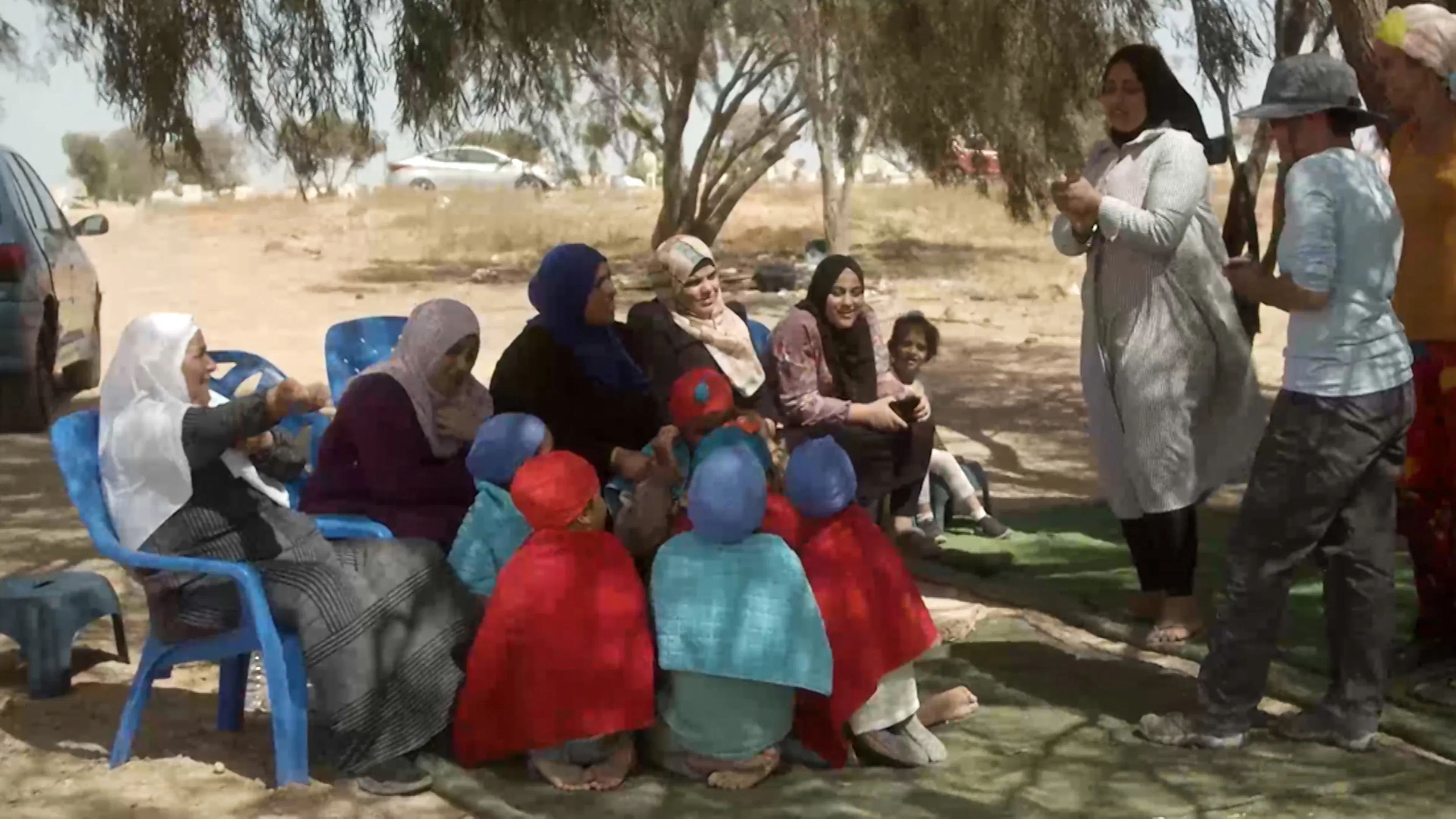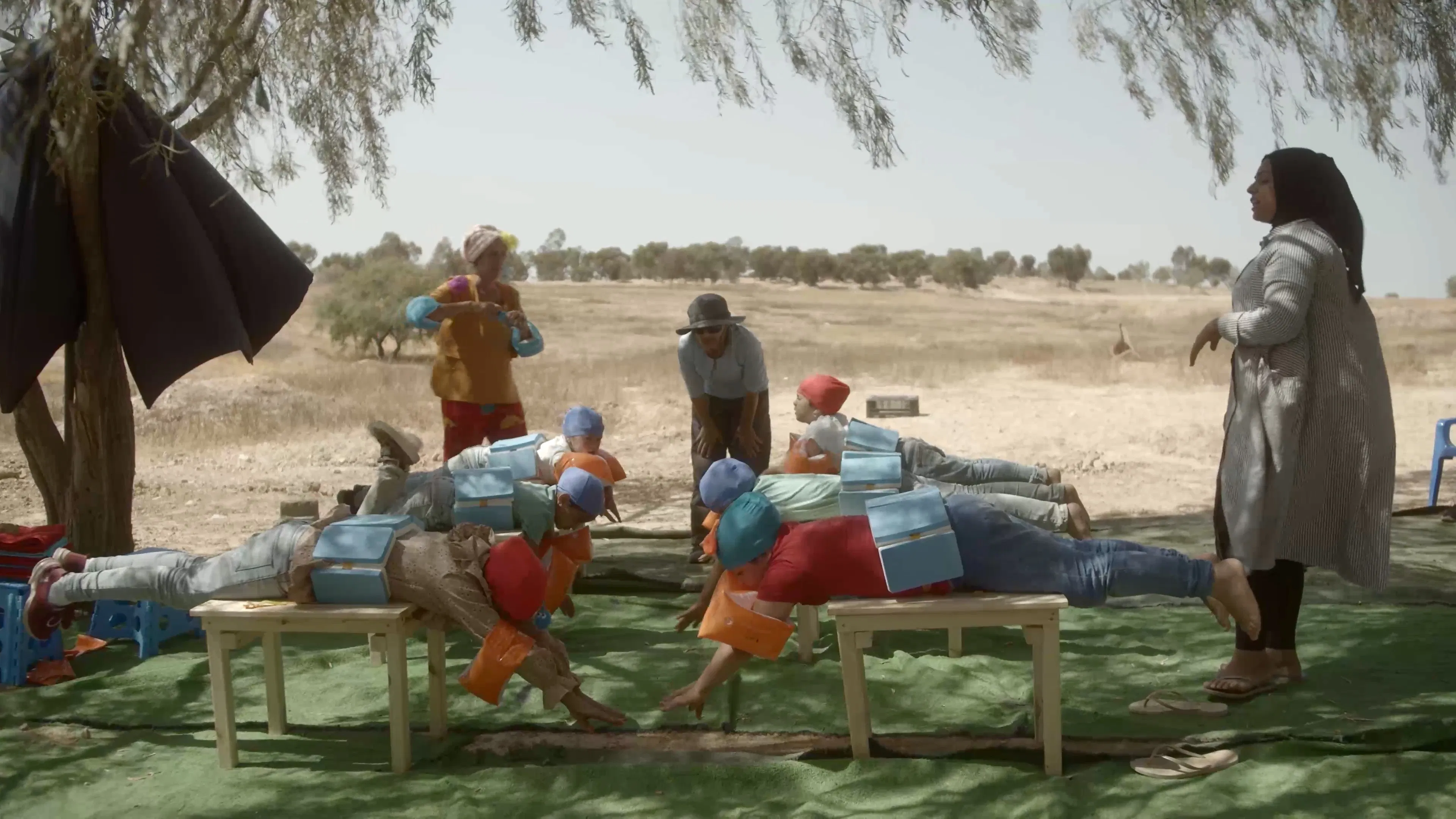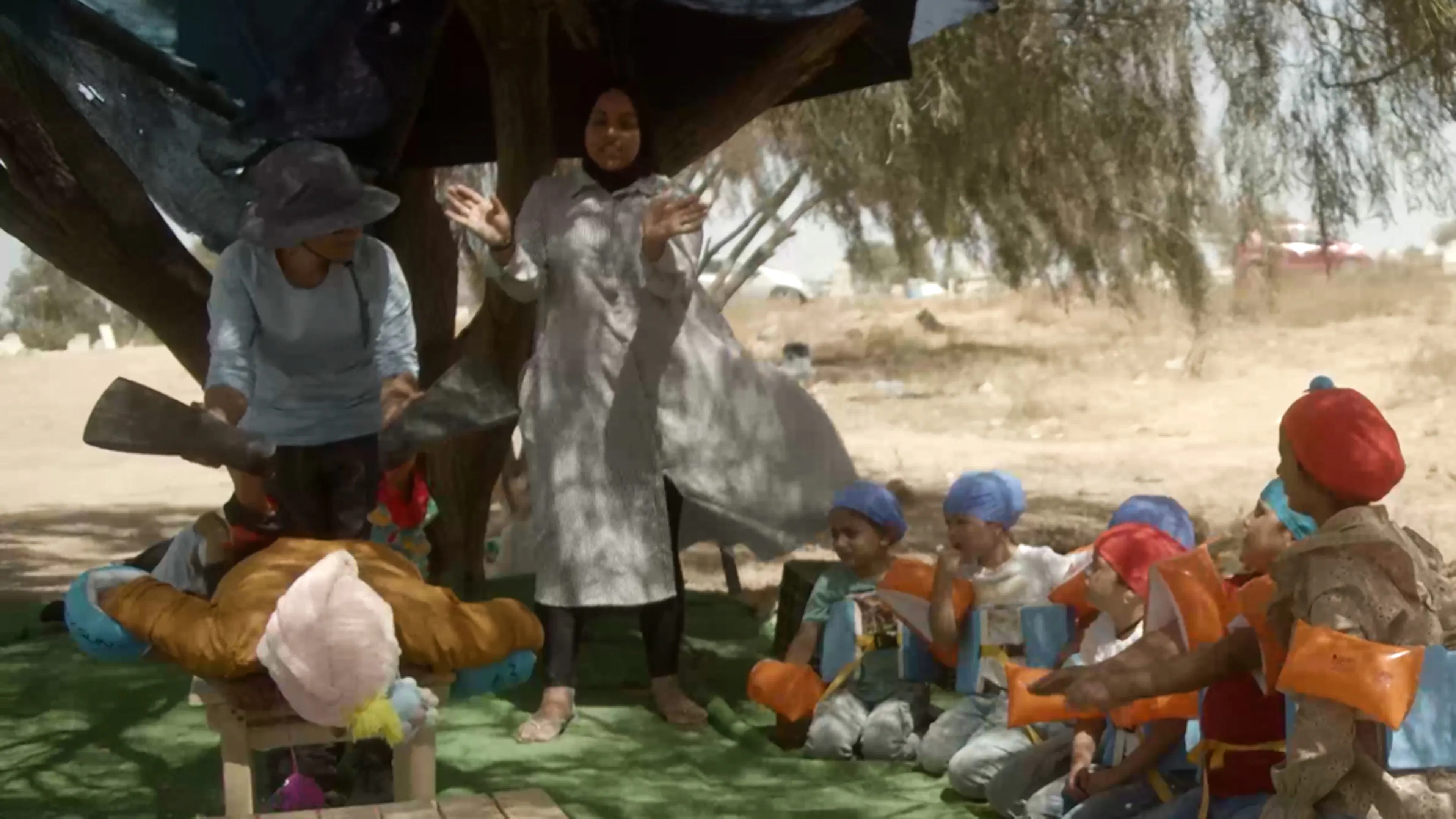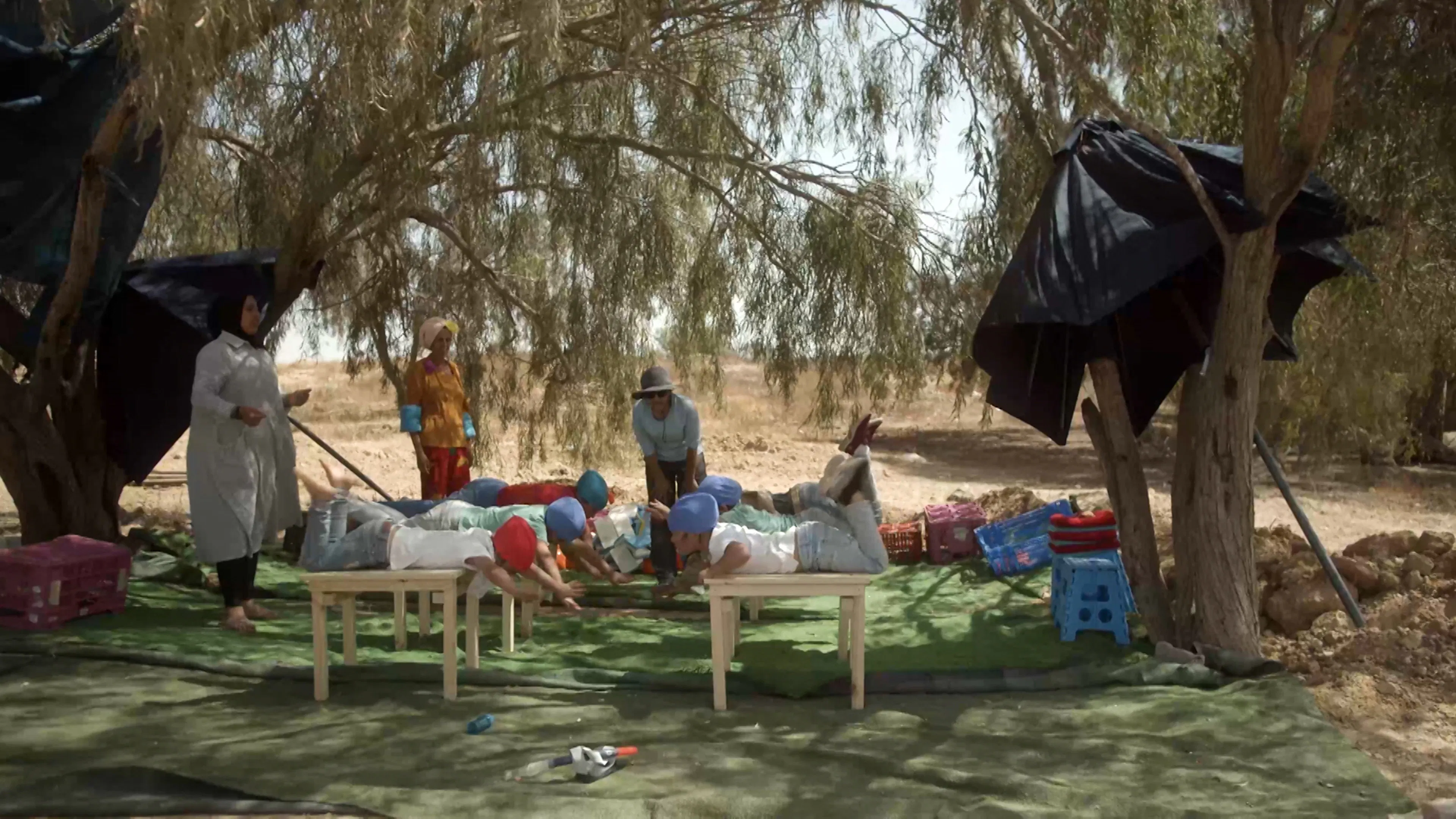 Swimming Lesson is a mockumentary film in which Bedouin girls are taught to swim in a waterless "pool." The work deals with the lack of swimming pools accessible to Bedouins in Israel — a product of institutionalized racism that stems from colonialism — which denies them swimming lessons and causes frequent cases of drowning. There are over 200,000 Arab-Bedouins living in the Negev region of Israel today, with access to one single swimming pool inaugurated in the Bedouin town of Rahat in 2018. Bedouins are not allowed to enter swimming pools in Jewish localities. The film raises awareness of this discrimination as an example of a much wider system of apartheid, while also looking toward a future world where a shortage of water due to global warming, drought, and evaporation compounds these injustices further.