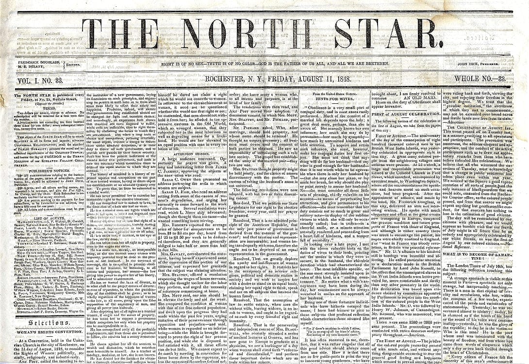 Frederick Douglass created an abolitionist newspaper called The North Star that addressed discrimination in American society. First published in Rochester, New York on December 3, 1847, Douglass felt that African American authors, editors, and orators should have their own paper with which to share their voices. The North Star, later renamed Frederick Douglass’ Paper, developed into one of the most influential African American antislavery publications of the pre-Civil War era. Published weekly, The North Star was four pages long and sold by subscription for $2.00 per year to more than 4,000 readers in the United States, Europe, and the West Indies. The paper included editorials, letters from readers, articles, poetry, and book reviews and advertisements. The North Star was last published in November 1859.