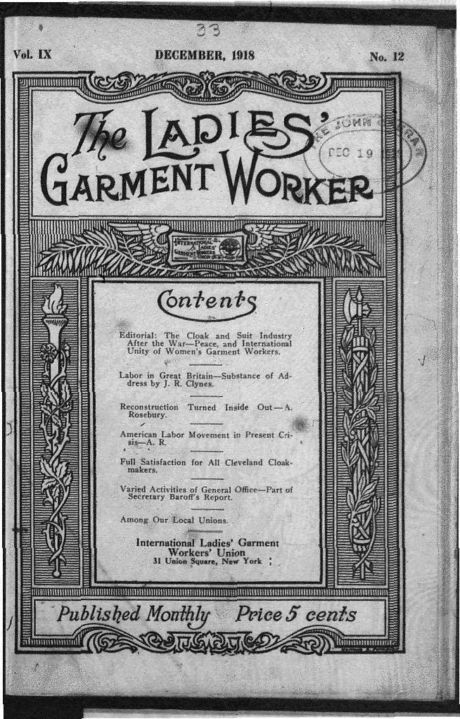 The Ladies Garment Worker was the official publication of the International Ladies’ Garment Workers’ Union (ILGWU), first published in April 1910 in New York City, until 1918. It included “editorials on the most important Problems in the Ladies Garment Industry and the labor movement in general,” a local labor union directory and short stories in English, Yiddish and Italian.