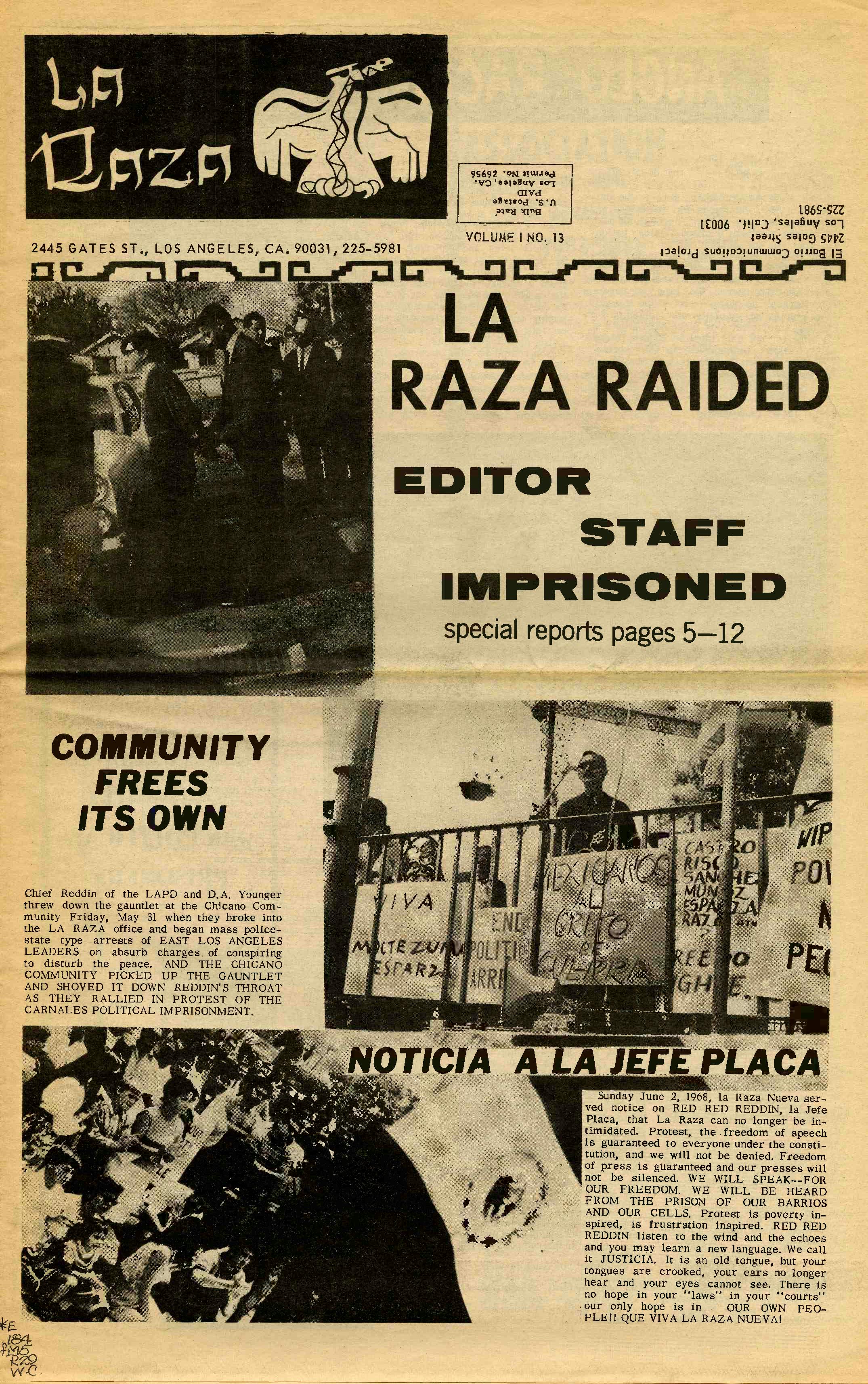 East L.A. Student Walkouts, also known as the “Chicano Blowouts,” were a series of protests in 1968 in which thousands of students walked out of schools to protest educational conditions for Chicanos in L.A.. Chicano Students and organizers created La Raza from 1967 until 1977, it was an eight page tabloid that covered the Chicano social movement. In its first issues, the newspaper called for improved representation of minorities among school administrators and teachers, safer conditions in schools populated by mostly minority students, and hot lunches for all students.