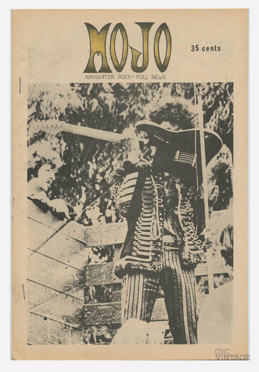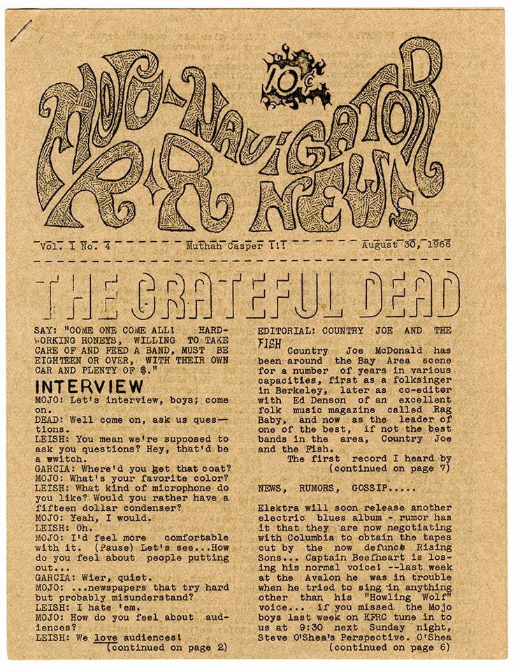 Created in San Francisco in 1966 by David Harris and Greg Shaw, Mojo Navigator would become the early influence for Rolling Stones magazine. Made with a Mimeograph and stapled, only fourteen issues were published beginning in August of 1966 and ceasing sometime in 1967. During this time Mojo Navigator included interviews with seminal bands such as the Grateful Dead and The Doors.