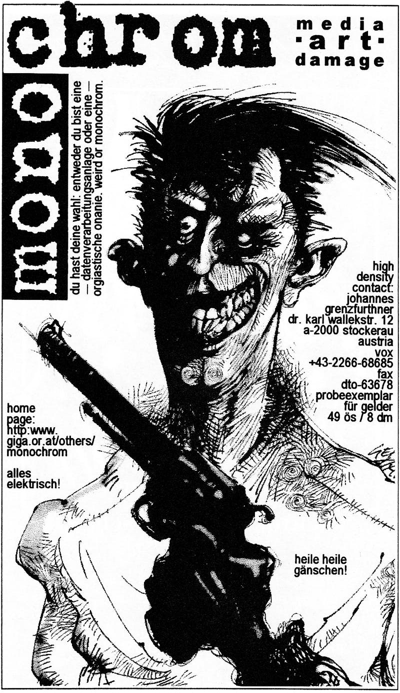 Monochrom started as an “E-Zine” in 1993 in Vienna, Austria. An “E-Zine” exists online like a blog and is also distributed like a newsletter. To this day is self-defined as "an unpeculiar mixture of proto-aesthetic fringe work, pop attitude, subcultural science and political activism."