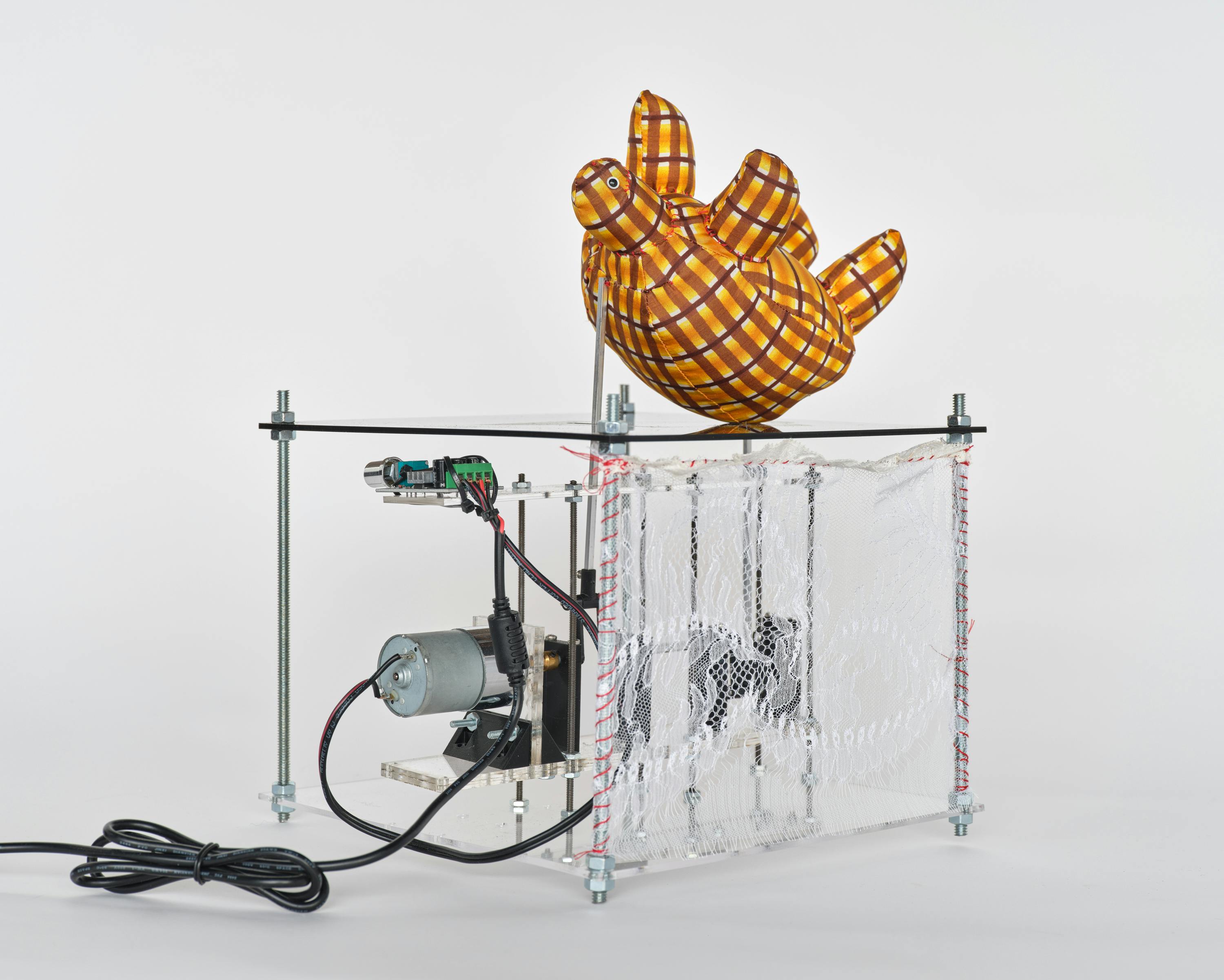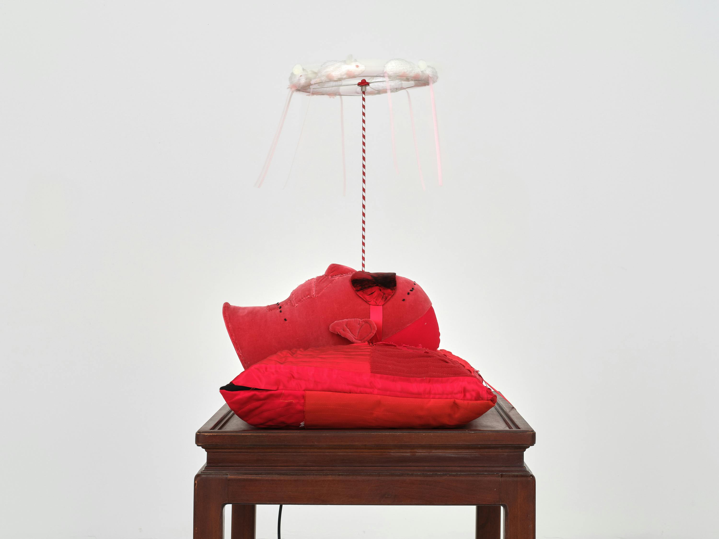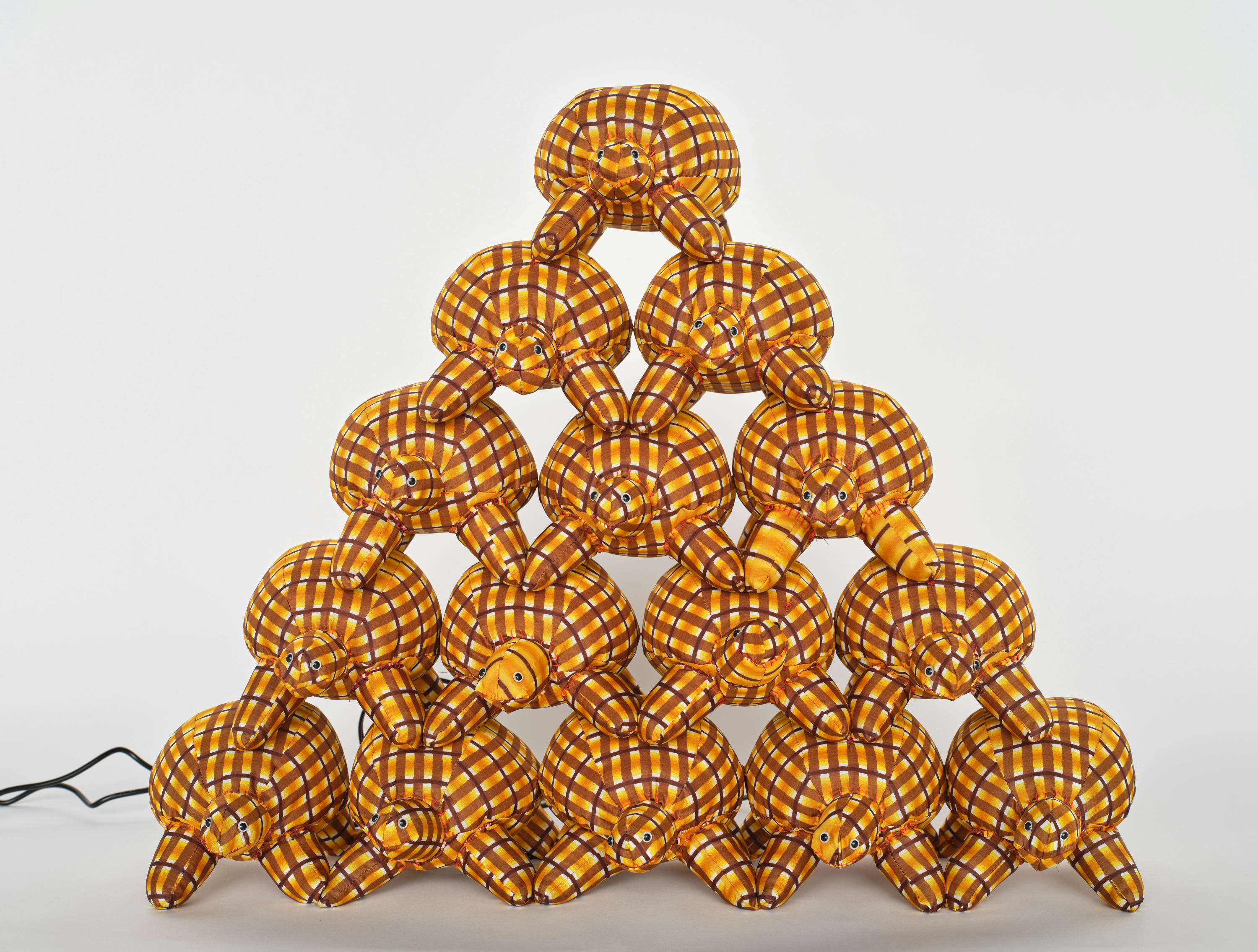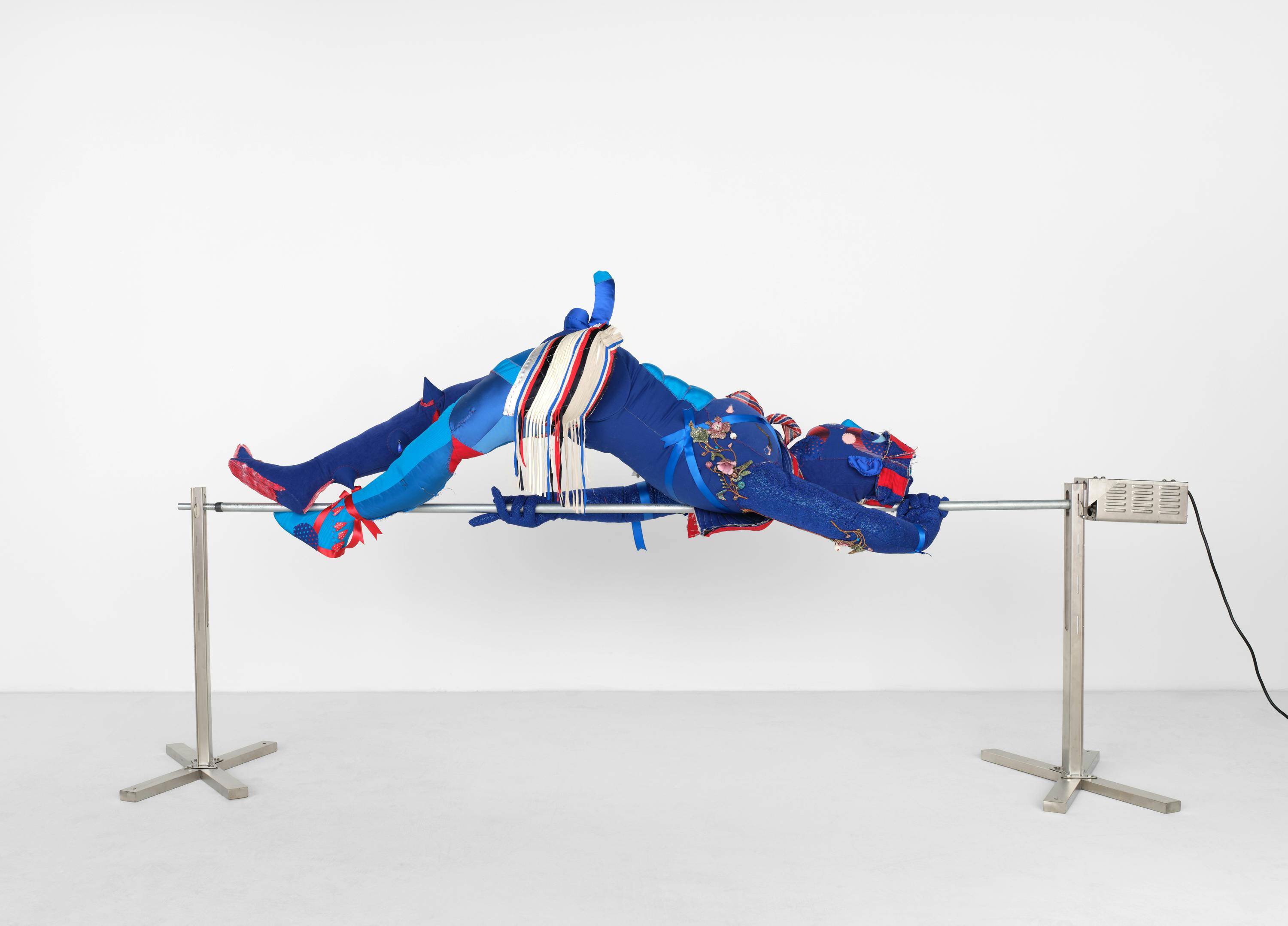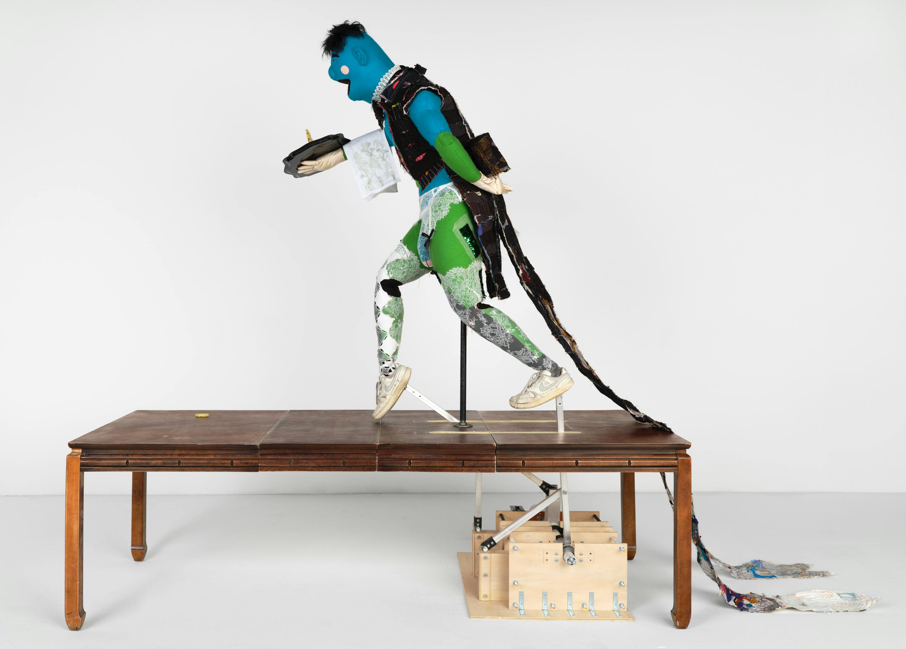 In Acts of Service, Keith Lafuente stages a carnivalesque installation of kinetic and static sculptures that explore the many connotations of “service”—sexual, military, culinary, religious, and altruistic. Animated fabric figures perform cycles of labor and desire: a go-go boy waiter balances on a table, a sailor pole dances on a pig spit, watched by tarsiers and turtles. Their movements repeat endlessly, visible to us but invisible to themselves.